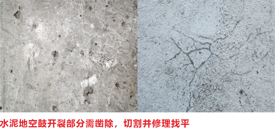 清除舊地坪,去除松散結構,提供粗糙、清潔、堅實的基層。如果基層有空鼓、開裂現(xiàn)象,則需要鑿除、切割并修理找平。