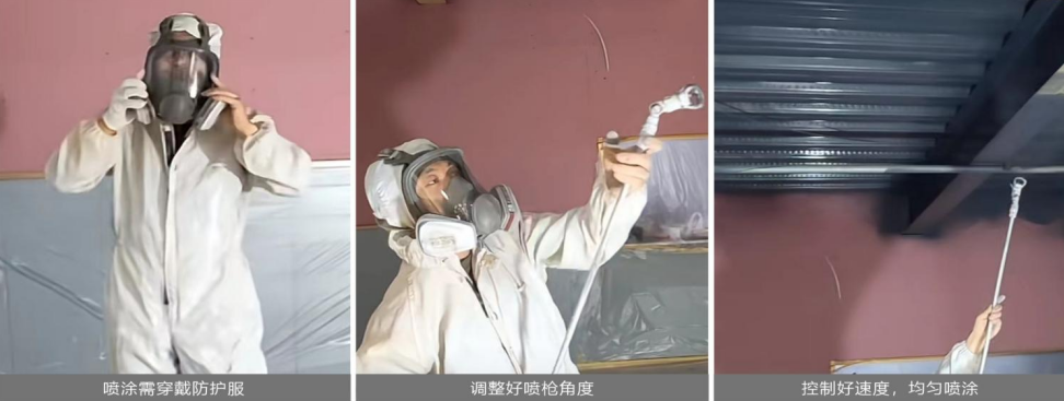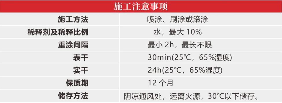 4、施工注意事項(xiàng):雨天或過度潮濕天氣禁止施工,保持施工環(huán)境的空氣流通;過度加水稀釋會增加涂裝風(fēng)險(xiǎn),并容易產(chǎn)生遮蓋力不足、漆膜不夠豐滿等問題,最終會降低涂膜 綜合性能,所以一次成膜不能太厚,建議單遍干膜厚度為30μm。