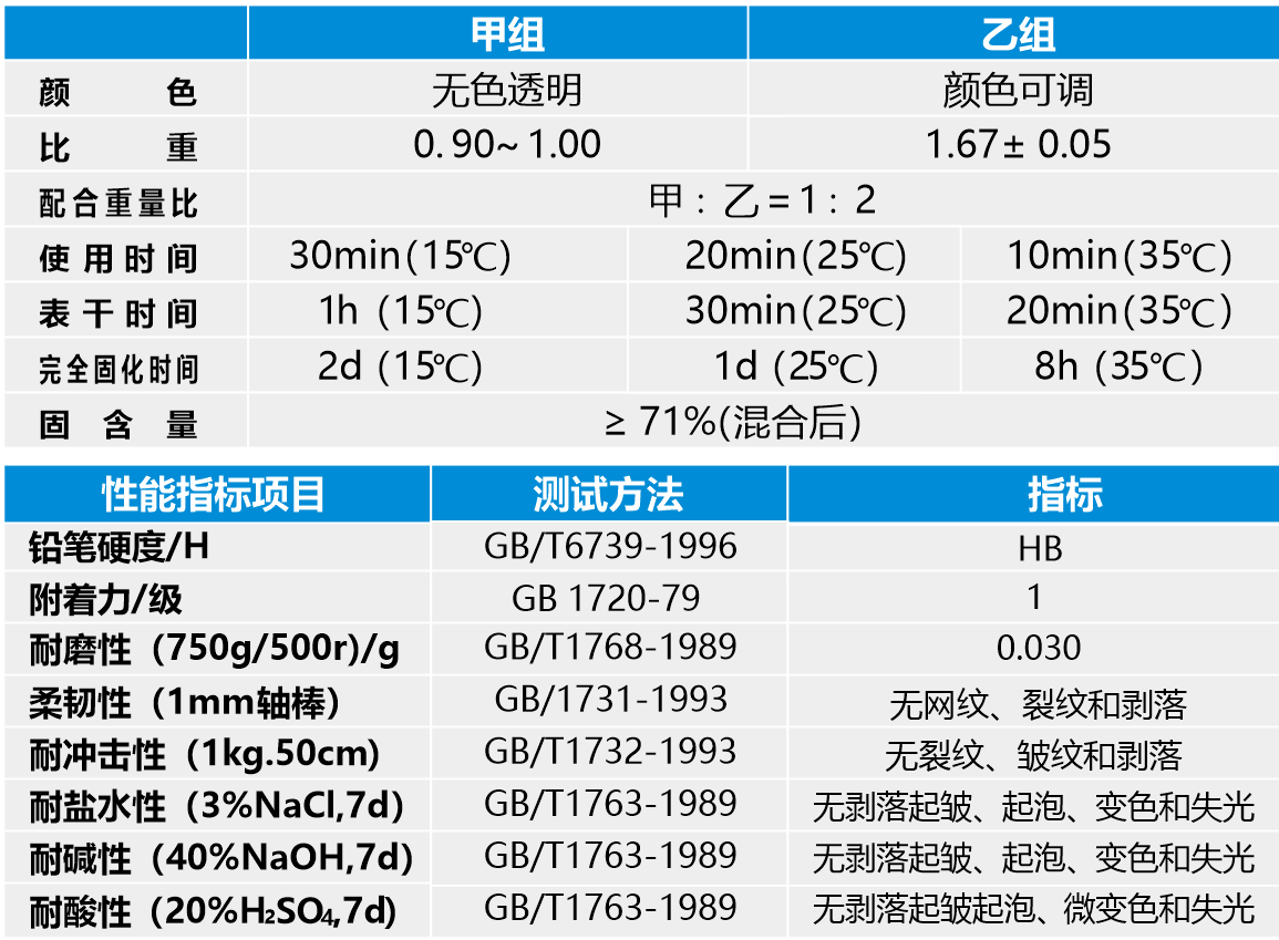 混合:貯存過程中,乙組可能會出現輕微沉淀,混合前先將乙組充分攪拌均勻;按比例將甲、乙組份倒入攪拌桶后攪拌均勻,混合立即施工。